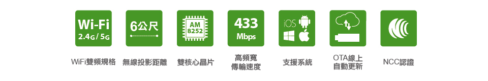 明星商品OTA線上自動更新,支援最新iOS 9 Airplay 鏡像功能等五大作業系統。